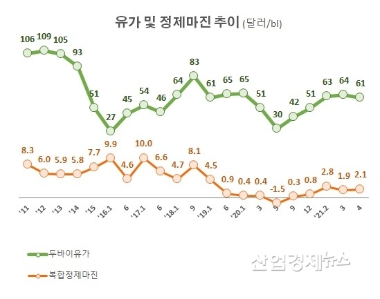 [산업경제뉴스 문성희 기자] 국제유가는 하락세를 보이고 있는 반면, 정제마진은 소폭 상승해서 다시 2달러 대를 회복했다.