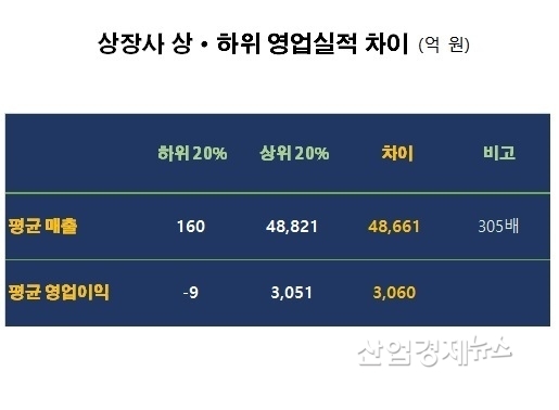 매출의 경우, 매출규모 하위 20%의 회사당 평균 매출액은 160.1억원인 반면, 상위 20%의 매출액은 4조8820.8억원으로 305배 더 컸다.