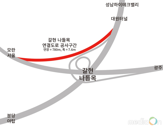 이번 공사구간 도로는 성남하이테크밸리~대원터널~갈현 나들목~모란·서울 방면 3번 국도로 진입로까지 한 번에 연결된다.