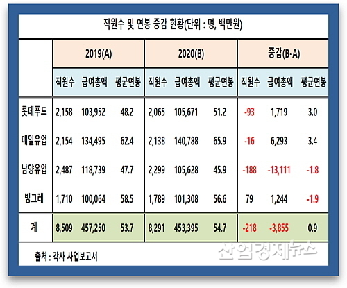 2020년 직원 평균연봉, 매일유업→빙그레→롯데푸드→남양유업 순