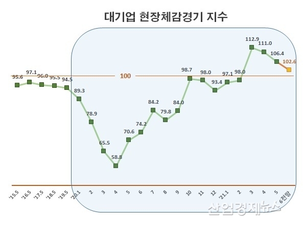 대기업들은 지난 3월에 수출 호조세를 보이며 실사지수가 112.9까지 올라가는 등 코로나19 이전보다 더 높은 긍정적 분위기를 전했지만 최근 원자재가격이 상승하면서 지수가 다소 하락했다.