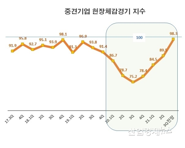 이 조사에 따르면 국내 중견기업들은 지난해 3분기에 코로나19의 여파로 지수가 75.2까지 떨어졌지만 그후 꾸준히 상승하면서 지난 2분기에는 89.5를 나타냈고, 오는 3분기에 대한 전망은 98.3을 나타내 기준점인 100에 거의 근접한 것으로 나타났다.