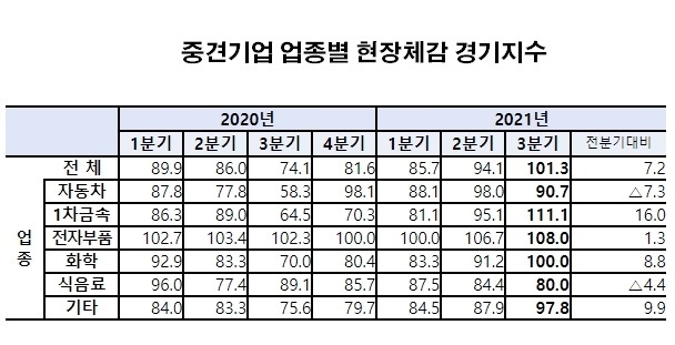 특히 중견기업 가운데 제조기업들은 3분기에 수출부문에서 100.7의 지수를 보이며 전체 지수의 상승세를 이끌었다. 이러한 수치는 2019년 2분기 이후 2년만에 100을 넘어선 수치다.