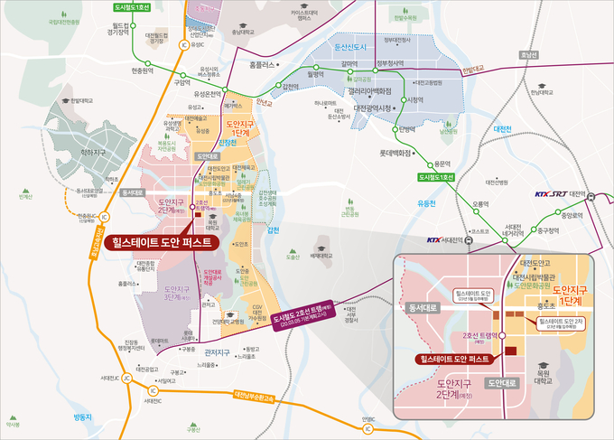 이 개발이 모두 완료되면 도안신도시는 총 5만8,000여 세대, 약 15만명의 인구를 품게 될 예정이어서 대전을 대표하는 주거지역으로 탈바꿈할 전망이다. 그 중에서도 힐스테이트 도안 퍼스트 일대는 앞서 공급된 힐스테이트 도안 1, 2차와 함께 약 1,500세대의 힐스테이트 브랜드 타운이 형성될 예정이다.