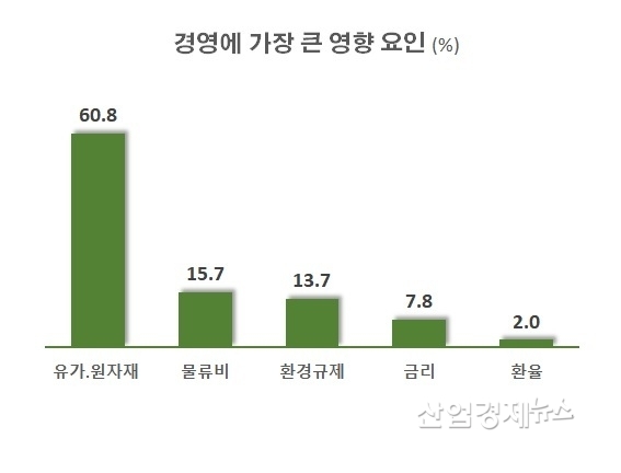 기업들은 유가 등 에너지 가격 상승, 구리 등 원자재 가격 상승, 컨테이너 등 물류비 상승 그리고 국내외 금리 상승으로, 경기회복국면에서도 울상을 짓고 있다는 설명이다. 특히 환경규제에 따른 탄소배출권 가격상승은 새로운 부담요인이 되고 있는 것으로 조사됐다.