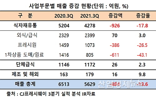 3Q 사업부별 매출, 식자재유통(-17.8%), 단체급식(2.3%), 제조(9.8%) 시현