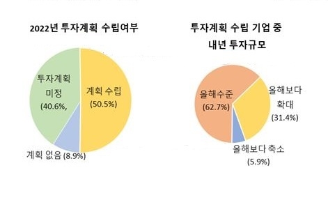 한국경제연구원(이하 ’한경연)이 매출액 500대 기업을 대상으로 ‘2022년 투자계획’을 조사한 결과, 응답기업의 49.5%가 내년도 투자계획이 없거나 아직 계획을 세우지 못하고 있다고 응답했다.
