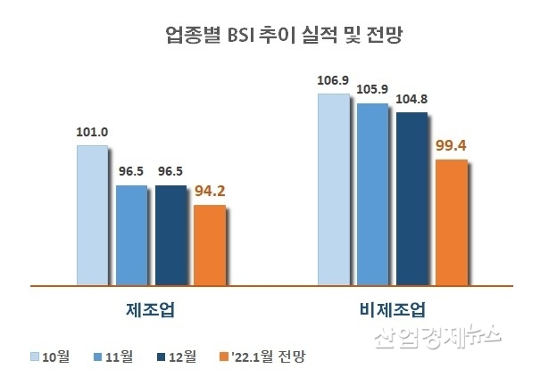 특히 운송장비 88.6, 금속 및 금속가공 85.3, 비금속 소재 86.7로 자동차 관련 업종이 반도체 수급 차질 등의 영향을 많이 받을 것으로 예상했다.