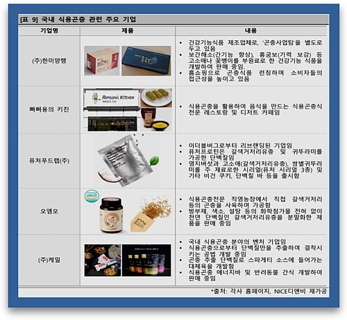이들 기업의 식용곤충 활용 사례를 (주)NICE디앤비 김슬기 전문위원의 연구보고서에 의거해 구체적으로 살펴보면,