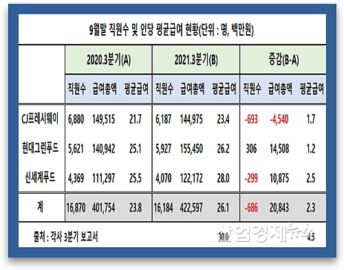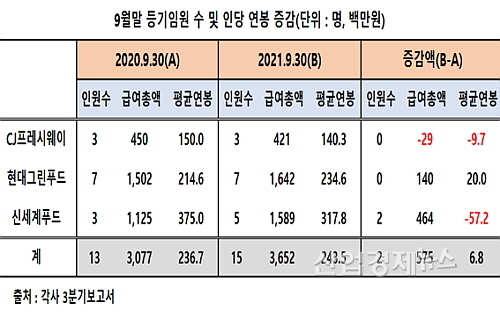 3Q 누적 직원 및 등기임원 연봉, 신세계푸드→현대그린푸드→CJ프레시웨이 순