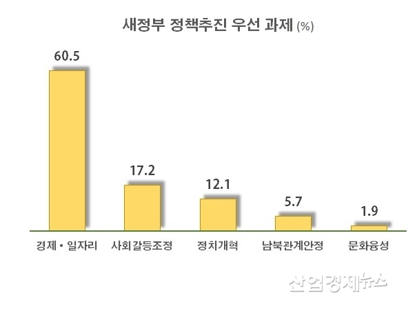 그 다음으로는 사회갈등 조정이 17.2%를 차지했고, 정치개혁 12.1%, 외교와 남북관계 안정 5.7%, 문화융성이 1.9%로 뒤를 이었다.
