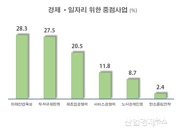 경제재도약을 통한 일자리창출을 차기정부 중점 추진 정책과제라고 응답한 기업들은, 보다 구체적 추진 사업으로 미래성장산업 육성지원(28.3%), 기업투자 촉진을 위한 규제 완화(27.5%), 기존 제조업 경쟁력 강화(20.5%) 등이 필요하다고 말했다.