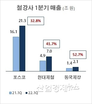 현대제철도 7조원의 매출을 시현하며 전년동기보다 41.7% 증가했고, 동국제강도 2조1천억원의 매출을 시현해 전년보다 52.7% 상승하는 실적을 기록했다.