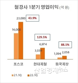 철강3사의 영업이익은 매출보다 더 크게 증가했다.