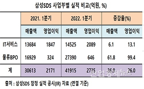 [산업경제뉴스 민경종 기자] 삼성SDS가 올 1분기 물류사업부(BPO)의 깜짝 성장에다 IT서비스가 소폭이나마 힘을 보태며 창사 처음으로 분기 매출 4조 시대를 연 것으로 밝혀졌다.