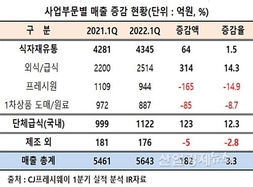[산업경제뉴스 민경종 기자] CJ프레시웨이가 올 1분기 외식/급식 관련 식자재유통과 단체급식사업부의 쌍끌이 선전에 힘입어 외형성장과 수익성 개선을 동시에 일궈낸 것으로 나타났다.