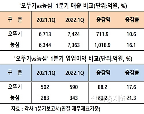 연결재무제표 기준 양사의 1분기 영업이익을 살펴보면 오뚜기가 590억 원을 시현, 전년 동기 502억 대비 17.6% 가량 증가한 반면에, 농심은 2021년 1분기 283억 대비 21.3% 증가한 343억 원을 올려 오뚜기 보다 3.7%P 우위의 손익성적표를 내밀은 것.