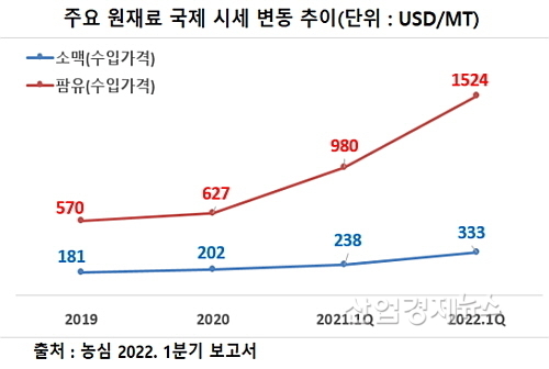 실제로 농심의 올 1분기보고서에 따르면 라면과 스낵의 주요 원재료인 소맥(밀가루)과 팜유의 1분기 말 국제 시세가 톤당 333달러와 1524달러로, 전년 동기의 238달러와 980달러 대비 각각 39.9%와 55.3%나 급등세를 이어가고 있는 상황이다.