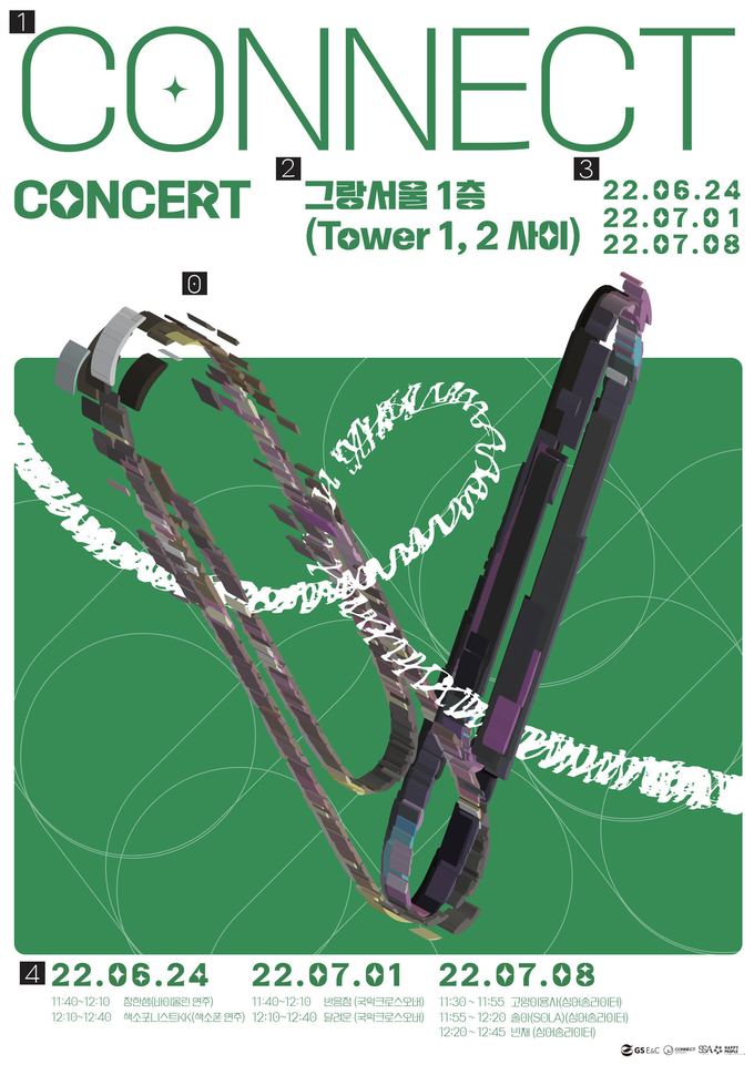 GS건설은 “신진 음악인들을 위해 서울 종로구 그랑서울 본사 공간을 공유해 진행하는 음악공연 ‘Connect Concert’를 개최한다고 23일 밝혔다. 이번 행사는 지난해 ESG시대 사회공헌활동 ‘나눔과 동행 2021’으로 기획된 음악공연과 발달 장애인 미술인을 위한 전시회 등에 이어 2022년 신규로 진행하는 문화예술인 지원사업이다. 공연은 6월 24일(금), 7월 1일(금), 7월 8일(금) 3회에 걸쳐 점심시간에 서울 종로구 GS건설 본사 그랑서울 지상(타워 1, 타워2 사이 1층)에서 진행된다.