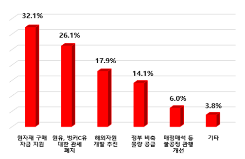 또한 정부가 원자재 수급 애로에 대응하기 위해서, 원자재 구매자금 지원 확대(32.1%), 원유 및 벙커C유에 대한 관세 폐지(26.1%), 해외자원개발 추진(17.9%) 등의 노력을 해야한다고 응답했다.