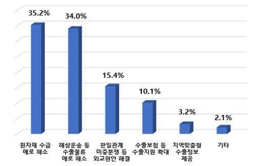 기업들은 수출 경쟁력 강화를 위한 정부 정책 우선순위로, 원자재 수급 애로 해소(35.2%), 해상운송 등 수출물류 애로 해소(34.0%), 한일관계, 미중무역분쟁 등 외교 현안 해결(15.4%) 등을 꼽았다.