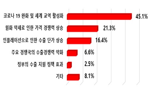 하반기 수출이 전년 동기 대비 증가할 것이라고 전망한 기업들은, 코로나19 완화 및 세계 교역 활성화(45.1%), 원화 약세로 인한 가격 경쟁력 상승(21.3%), 인플레이션으로 인한 수출 단가 상승(16.4%) 등을 주요 요인으로 꼽았다.