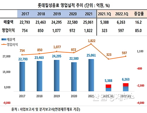 이 회사 분기보고서에 따르면 롯데칠성의 1분기 연결매출은 약 6263억 원으로 전년 동기 5388억 대비 약 16.6% 성장했다. 영업이익 또한 약 597억 원을 시현, 지난해 1분기 약 323억 원 대비 무려 85.%나 급증, 양호한 성적표를 시장과 투자자에게 내밀었다.