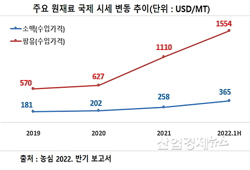 특히 올 상반기 기준 전사 매출 비중이 약 79%에 달하는 주력 라면과 14.2% 점유율의 스낵류 등 93.1%에 달하는 제품의 주요 원재료인 소맥(밀가루)과 팜유의 상반기 평균 수입가격이 지난해 말과 비교해 41.5%와 40.0%씩 급등한 점이 손익을 크게 훼손시킨 것으로 분석된다.