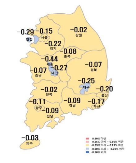 9월 첫째 주 전국 아파트가격은 한 주 전 -0.15%에서 -0.17%로 확대됐고, 수도권도 -0.20%에서 -0.21%로, 지방도 -0.11%에서 -0.13%로 하락폭이 커지는 추세였다. 특히 인천은 -0.29%, 경기도 -0.22%로 가격이 급락세를 보였고, 세종은 무려 -0.44%의 하락률을 보이며 폭락세라 불릴만큼 가격이 급락했다.