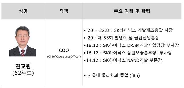 지난달 31일까지 SK하이닉스에서 근무해온 진 COO는 정통 엔지니어 출신이다. 개발, 양산, 품질 등 반도체 생산 전반을 책임지면서 SK하이닉스를 세계 최고의 반도체 제조 기업으로 키워내는데 큰 역할을 했다. 이런 공로를 인정받아 지난해 말에는 국내 공학분야 최고 권위 단체인 한국공학한림원 정회원에 선정됐다.