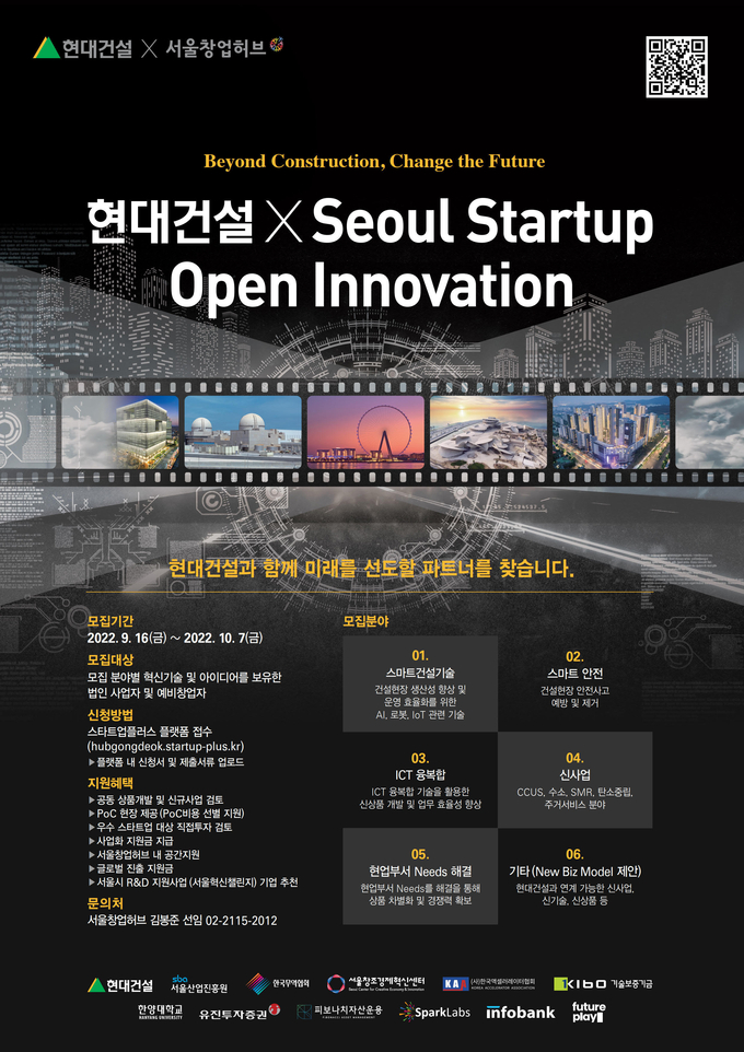[산업경제뉴스 강민구 기자]  현대건설이 우수 스타트업의 혁신 기술 및 아이디어를 발굴하기 위해 서울시 산하 창업지원기관인 서울산업진흥원과 함께 ‘2022 현대건설 x Seoul Startup Open Innovation’ 공모전을 개최한다고 15일 밝혔다.