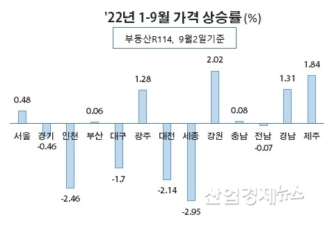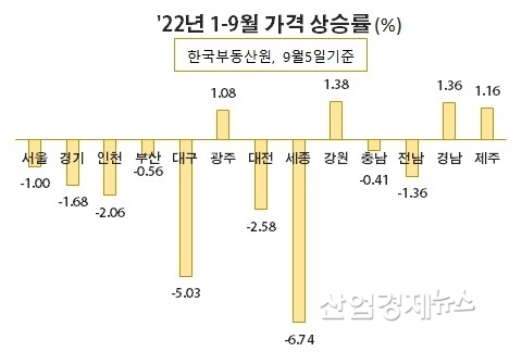 세종과 인천 외에도 대전이 -2.14%, 대구가 -1.7%, 경기가 -0.46%의 상승률을 기록하며 가격이 하락한 것으로 조사됐다.