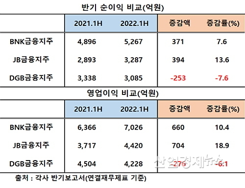 반기 영업이익 증가율,  JB 18.9%→BNK 10.4%→DGB –6.1% 순