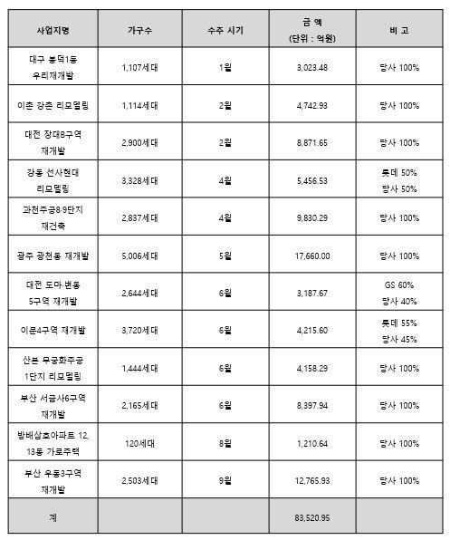▲대구 봉덕1동 우리재개발 ▲이촌 강촌 리모델링 ▲대전 장대B구역 재개발 ▲강동 선사현대 리모델링 ▲과천주공8․9단지 재건축 ▲광주 광천동 재개발 ▲대전 도마․변동5구역 재개발 ▲이문4구역 재개발 ▲산본 무궁화주공1단지 리모델링 ▲부산 서금사6구역 재개발 ▲방배삼호아파트 12, 13동 가로주택정비사업에 이어 이번 부산 우동3구역 재개발사업을 수주하며 누적 수주액 8조 3,520억원을 달성, 창사 이래 최초 8조클럽 가입과 동시에 국내 건설업계 도시정비사업 수주고 신기록 달성이라는 새로운 역사를 썼다.