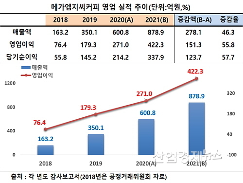 메가커피의 최근 3개년 감사보고서에 따르면 먼저 매출은 지난 2018년 163.2억 원에서 2019년 350.1억, 2020년 600.8억, 2021년 878.9억 원을 시현, 해마다 고공행진을 펼치고 있다. 3년간 매출 증가율은 438.5%로 연평균 146.2%씩 성장한 셈이다.