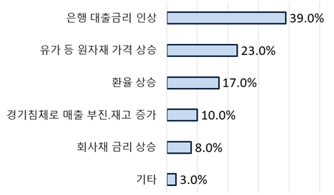 [산업경제뉴스 문성희 기자] 매출 1,000대 제조업의 37%는 이미 영업이익으로 이자비용을 감당하기 어려운 상황이며, 오는 12일 금융통화위원회에서 기준금리를 0.25%P만 더 올려도 절반이 취약기업이 될 수 있다는 보고서가 나왔다.