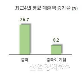 중국기업들은 최근 4년 26.7%의 매출액 증가율을 기록하며 그야말로 초고속 성장세를 보이고 있다. 중국외 다른 국가의 매출액 증가율은 8.2%로, 중국 반도체기업들은 3배나 빠르게 외형을 키우고 있는 것으로 조사됐다.