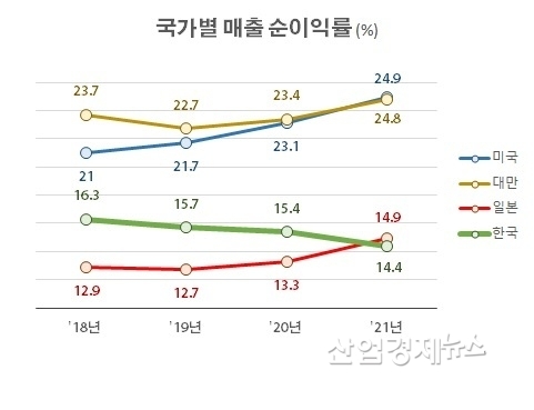 기업의 수익성 측면을 살펴보면, 한국 반도체 기업의 매출액 순이익률은 2018년 16.3%에서 2021년 14.4%로 1.9%p 감소한 것으로 나타났다.