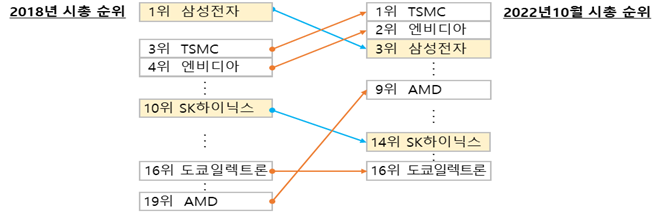 2018년 글로벌 반도체 시총 1위였던 삼성전자는 파운드리 TSMC(대만), 팹리스 엔비디아(美)에 자리를 내주며 3위로 밀렸다. SK하이닉스는 2018년 10위였지만 19위였던 팹리스 AMD(美) 등에 추월당해 14위를 기록했다.