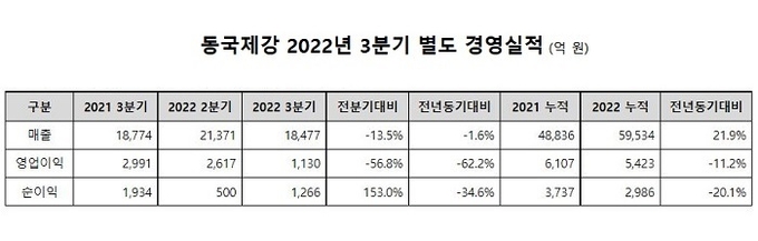 또, "전방산업 수요 침체에도 수익성 위주의 판매 전략을 지속해 왔으며, 인터지스, 동국시스템즈 등 종속회사 실적 개선으로 수익을 일부 보존했다"고 설명했다.