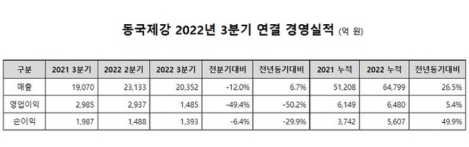 동국제강은 3분기에 연결기준으로 매출 2조 352억원, 영업이익 1,485억원, 순이익 1,393억원을 기록했다고 발표했다. 전년 동기 대비 매출은 6.7% 증가했지만, 영업이익과 순이익은 각각 50.2%, 29.9% 줄었다.