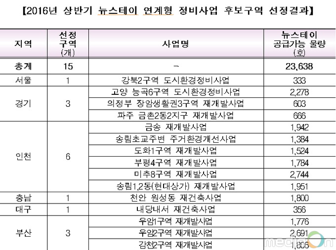 (미디어온) 국토교통부는 「2016년 상반기 뉴스테이 연계형 정비사업」 공모 결과, 공모에 참여한 37개 정비구역 중 서울 강북 2구역 등 전국 6개 시․도, 15개 정비구역을 뉴스테이 정비사업 후보구역으로 선정하였다고 밝혔다.