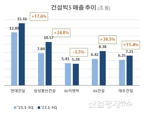 건설빅5의 올해 1~3분기 매출을 살펴보면, 현대건설은 15.2조원의 매출을 기록하면서, 다른 건설사에 비해 압도적으로 큰 규모를 유지하고 있다. 한때 현대건설과 1, 2위를 다퉜던 삼성물산 건설부문은 10.6조원으로 현대건설과 큰 차이를 보이며 두 번째를 기록했고, GS건설은 8.4조원, 대우건설은 7.2조원, DL이앤씨(舊 대림산업)는 5.2조원으로 뒤를 이었다.