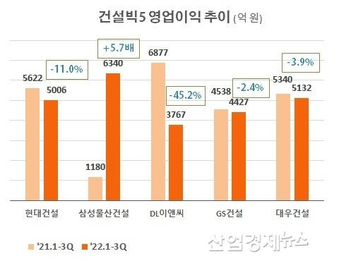 건설빅5는 올해 3분기까지 외형은 확대됐지만, 수익면에서는 다소 축소되는 모습을 보였다. 업계에서는 高물가, 高금리, 高환율 등 원가와 비용 증가로 건설사들의 수익력이 저하된 것으로 분석하고 있다.