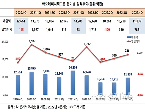 아모레퍼시픽그룹이 최근 공개한 IR보고서(잠정실적)에 따르면 먼저 4분기 매출은 연결재무제표기준 1조1839억 원을 시현, 전년 동기 1조4206억 대비 약 2367억 원이 감소해, 16.7% 가량 후퇴했다.