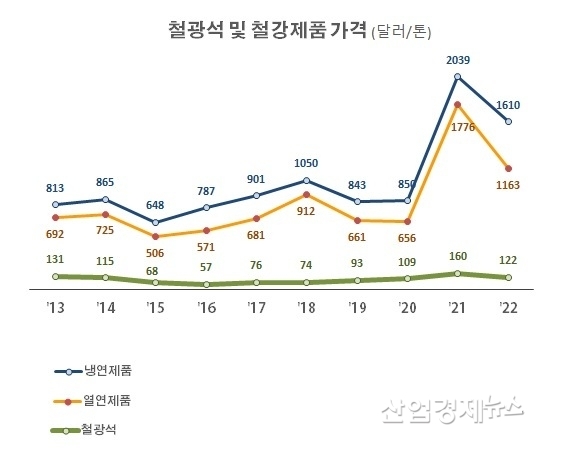 코로나로 인해 철강 생산이 줄어들면서 2021년 철광제품가격이 2~3배 올랐다. 열연제품은 2020년 톤당 656달러에서 2021년 1776달러로 2.7배 상승했고, 냉연제품은 850달러에서 2039달러로 2.4배 상승했다. 반면 철광석 가격은 109달러에서 160달러로 47% 상승했다.