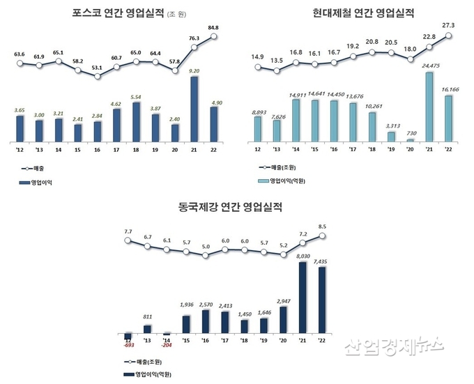 포스코의 매출은 2020년 58조원에서 2021년 76조원, 그리고 2022년에는 85조원으로 증가했다. 현대제철도 2020년 18조원에서 2021년에 23조원 그리고 지난해 27조원으로 증가했고, 동국제강도 5.2조원, 7.2조원, 8.5조원으로 증가하며 외형이 빠른 속도로 커졌다.