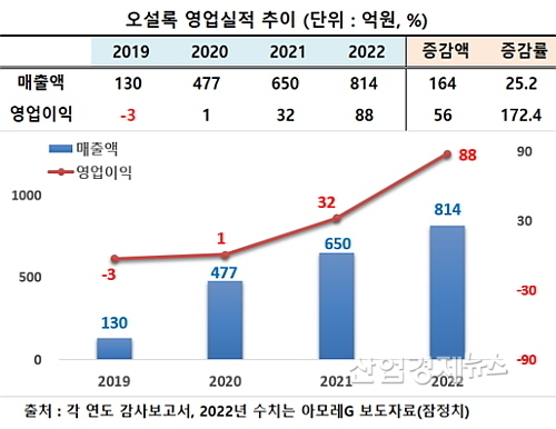 오설록 감사보고서와 아모레퍼시픽그룹의 잠정실적 관련 보도 자료에 따르면 지난해 매출은 약 814억 원으로 직전년도 650억 대비 164억이 늘어 25.2% 성장했고, 영업이익은 88억 원을 시현, 전년도 32억 대비 172.4%나 급증했다.