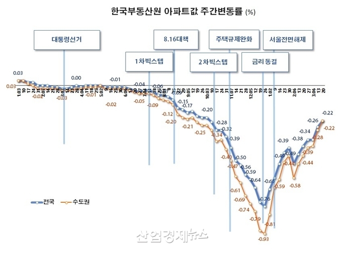 최근 금리 상승이 멈추고 거래량도 늘면서, 시장의 주택가격 추이도 달라졌다. 매주 아파트가격 변동률을 조사하는 한국부동산원에 따르면 지난주 전국 아파트 주간변동률은 -0.22%로 조사됐다. 지난해 말에는 -0.76%였는데 3개월만에 3분의 1로 줄었다.