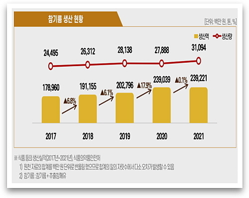 한국농수산식품유통공사 식품산업통계정보시스템에 따르면 지난 2021년 기준 국내 참기름시장 생산량은 3만1094톤으로 2017년 2만4495톤과 비교해 약 26.9% 증가했으며, 생산액 또한 2017년 약 1789억에서 2392억 원으로 33.7% 가량 신장했다.